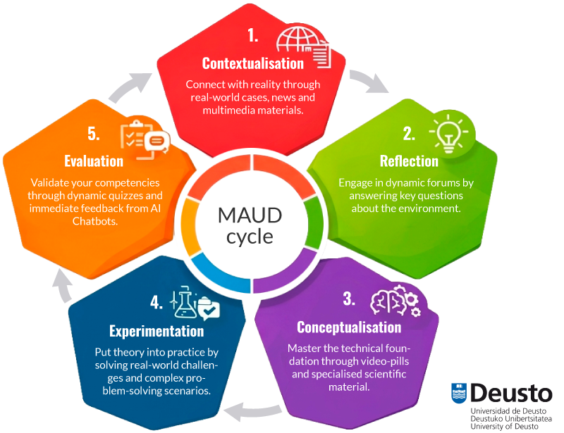 Each module is structured into five sections, each with a specific objective. This five-section structure follows the MAUD learning model, which is supported by the University of Deusto. This model represents the pedagogical strategy of the University of Deusto to facilitate the acquisition of new knowledge.